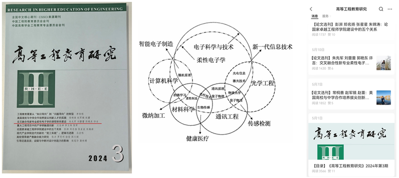 近日,我院朱先軍副教授、劉蕾蕾教授、郭艷東副教授和許吉副教授等人,在國內(nèi)工程教育研究權(quán)威期刊《高等工程教育研究》上發(fā)表題為《交叉融合性新專業(yè)柔性電子學(xué)的課程體系建設(shè)》的教學(xué)改革研究論文。論文闡述了柔性電子學(xué)專業(yè)多學(xué)科交叉融合性的特點,著重介紹了我院在面向交叉融合的前沿學(xué)科需求,以學(xué)生為中心,以產(chǎn)業(yè)需求為導(dǎo)向、突出多學(xué)科交叉融合的特點、引入前沿技術(shù)進(jìn)行柔性電子人才培養(yǎng)的課程體系構(gòu)建和優(yōu)化的思路,重點介紹了專業(yè)核心課程的特色和實踐教學(xué)環(huán)節(jié)設(shè)置,詳細(xì)介紹了傳統(tǒng)課程融合交叉學(xué)科特色的教學(xué)內(nèi)容改革。柔性電子學(xué)是面向國家重大戰(zhàn)略需求的跨學(xué)科交叉融合領(lǐng)域設(shè)立的新專業(yè),我校于2021年向教育部申報設(shè)立柔性電子學(xué)專業(yè)并成功獲批,于2022年9月招收第一屆本科生。我院柔性電子學(xué)專業(yè)師資隊伍建設(shè)、課程體系建設(shè)和學(xué)科發(fā)展等如火如荼的開展,并取得了良好實效。柔性電子學(xué)專業(yè)課程體系建設(shè)相關(guān)研究受到了《高等工程教育研究》期刊編委的青睞,刊發(fā)在2024年第3期“新工科研究與實踐”專欄,并作為選文在其公眾號上推廣,受到了國內(nèi)高等教育界學(xué)者們關(guān)注。該教學(xué)研究成果得到南京郵電大學(xué)本科教改項目和江蘇省高等教育教學(xué)改革研究項目