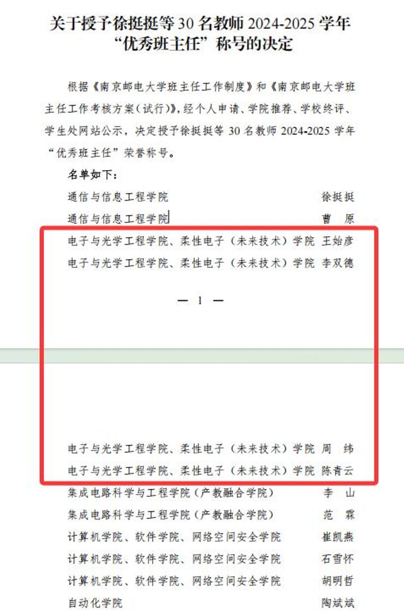 近日,南京郵電大學(xué)2024-2025學(xué)年“優(yōu)秀班主任”評選結(jié)果正式揭曉。全校共30位教師獲此殊榮,其中,電子與光學(xué)工程學(xué)院、柔性電子(未來技術(shù))學(xué)院共有四位教師光榮入選,分別是王始彥、李雙德、周緯、陳青云。本次評選注重學(xué)生的真實反饋,根據(jù)“學(xué)生評價情況”(即班主任工作測評分?jǐn)?shù))和班主任提交的各類履職材料,對各位班主任老師的履職情況進(jìn)行綜合評定,最終擇優(yōu)入選。電光柔院此次能夠有四位教師脫穎而出,榮獲校級“優(yōu)秀班主任”稱號,是學(xué)校對學(xué)院班主任工作整體水平和育人實效的高度認(rèn)可。入選老師在日常工作中,始終堅守育人初心,恪盡職守,在思想引領(lǐng)、學(xué)業(yè)指導(dǎo)、生涯規(guī)劃、班級管理等方面傾注了大量心力,贏得了學(xué)生一致好評。此次優(yōu)異成績的取得是學(xué)院長期以來堅持立德樹人根本任務(wù)、不斷加強和改進(jìn)班主任工作的成果體現(xiàn)。電光柔院將以此為契機,持續(xù)深化班主任隊伍建設(shè),充分發(fā)揮優(yōu)秀班主任的示范引領(lǐng)作用,不斷探索學(xué)生工作的新思路、新方法,努力提升人才培養(yǎng)質(zhì)量,為學(xué)生的全面成長成才和學(xué)校的高質(zhì)量發(fā)展做出更大貢獻(xiàn)。撰稿:祝騰審核:徐磊編輯:祝騰